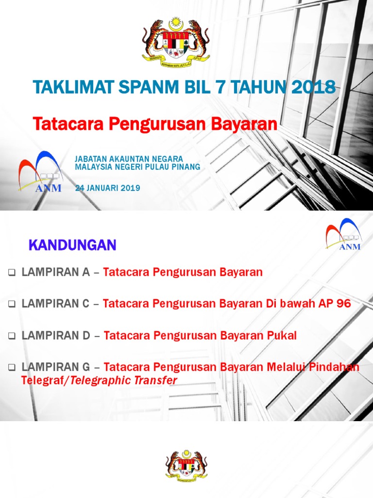 . TAKLIMAT SPANM BIL 7 TAHUN 2018 Tatacara Pengurusan Bayaran JABATAN AKAUNTAN NEGARA MALAYSIA NEGERI PULAU PINANG 24 JANUARI 2019. Sehubungan dengan itu sila rujuk pautan berikut untuk rujukan pihak tuanpuan selanjutnya. SPANM BIL 7 TAHUN 2018 Tatacara Pengurusan Bayaran.